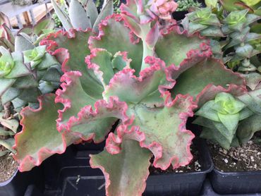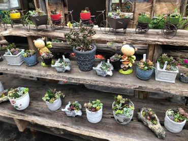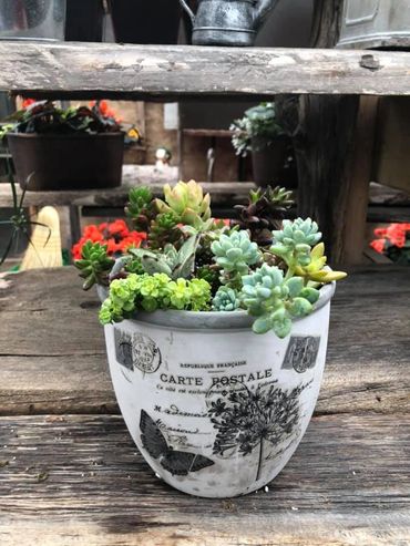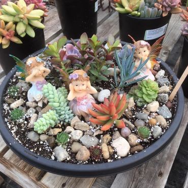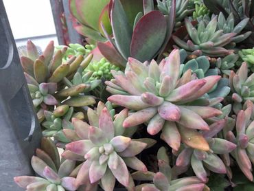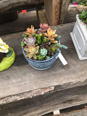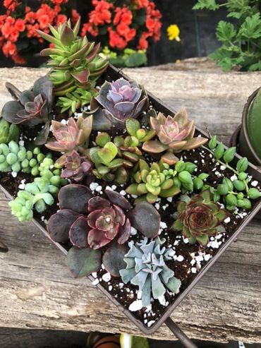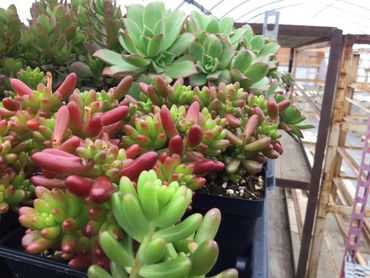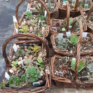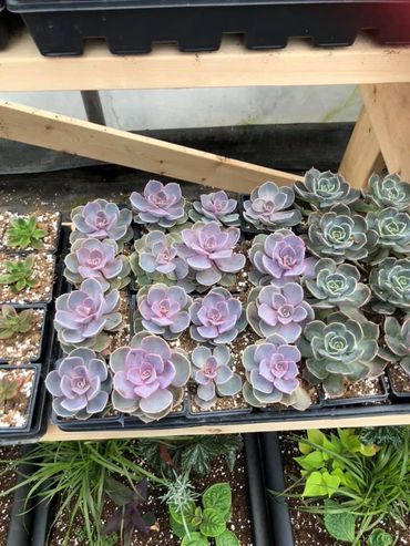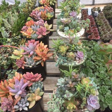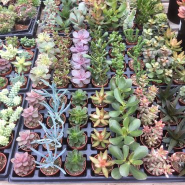 We carry a revolving assortment of aeoniums, sempervivums, echiveria, crassula, sedeveria, lithops, haworthoria, aloe, sedum, and various cactus!